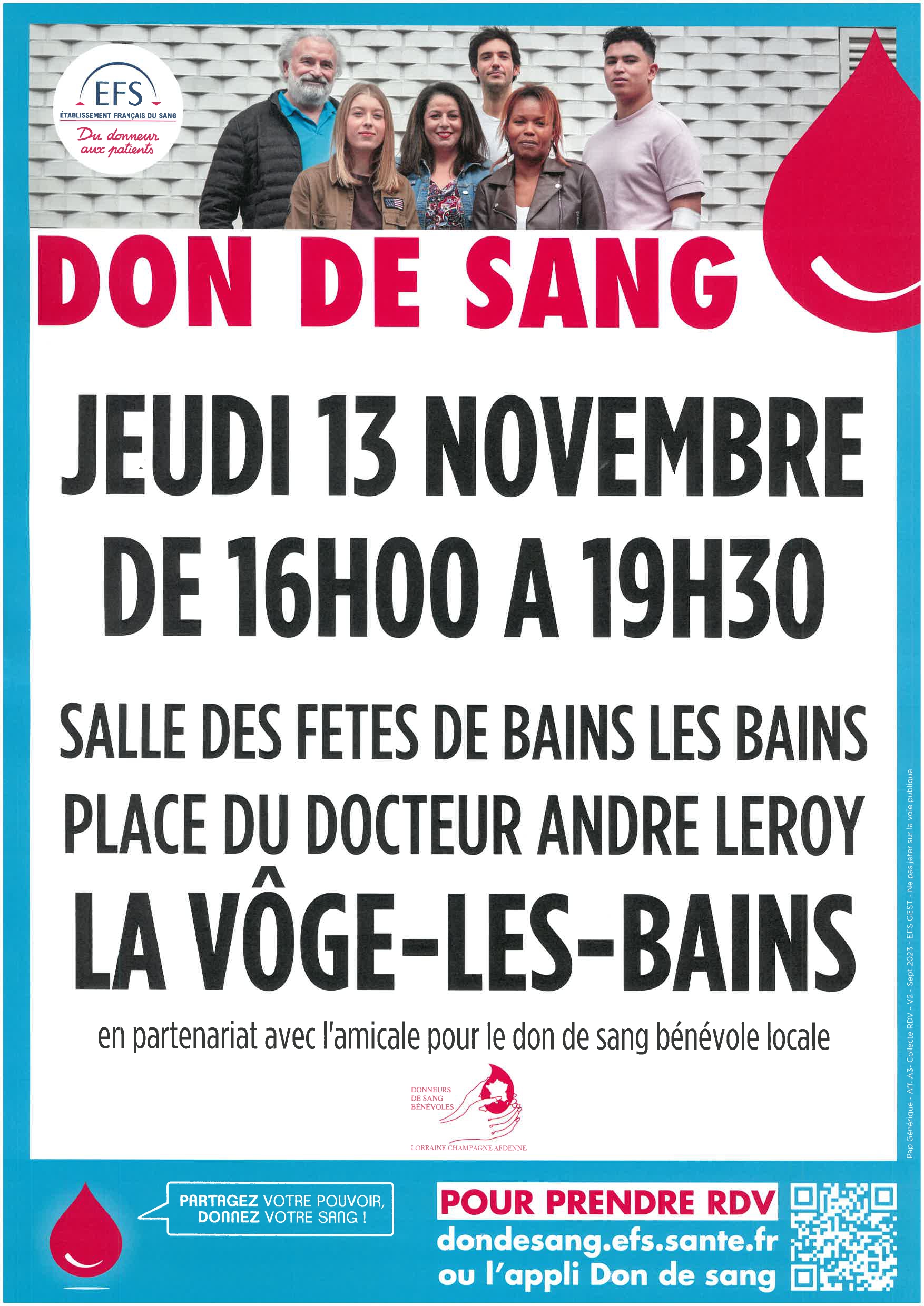 L’amicale des Donneurs de Sang Bains-les Bains et Environs organise sa prochaine collecte le Jeudi 13 Novembre prochain de 16h à 19h30.